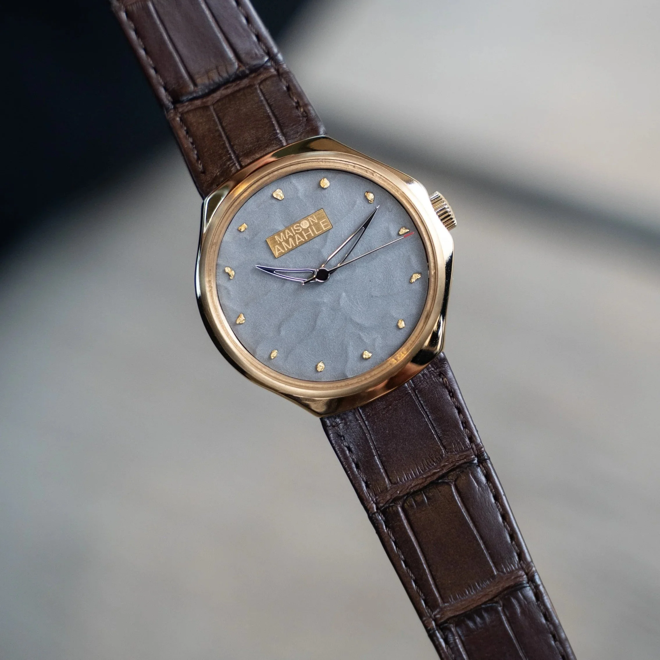 From mine to wrist. The hour indexes formed from 24-carat gold pebbles, each raw and irregular in shape. These natural fragments pass through a rigorous selection process before being individually hand-set onto the dial. Making no two dials the same.