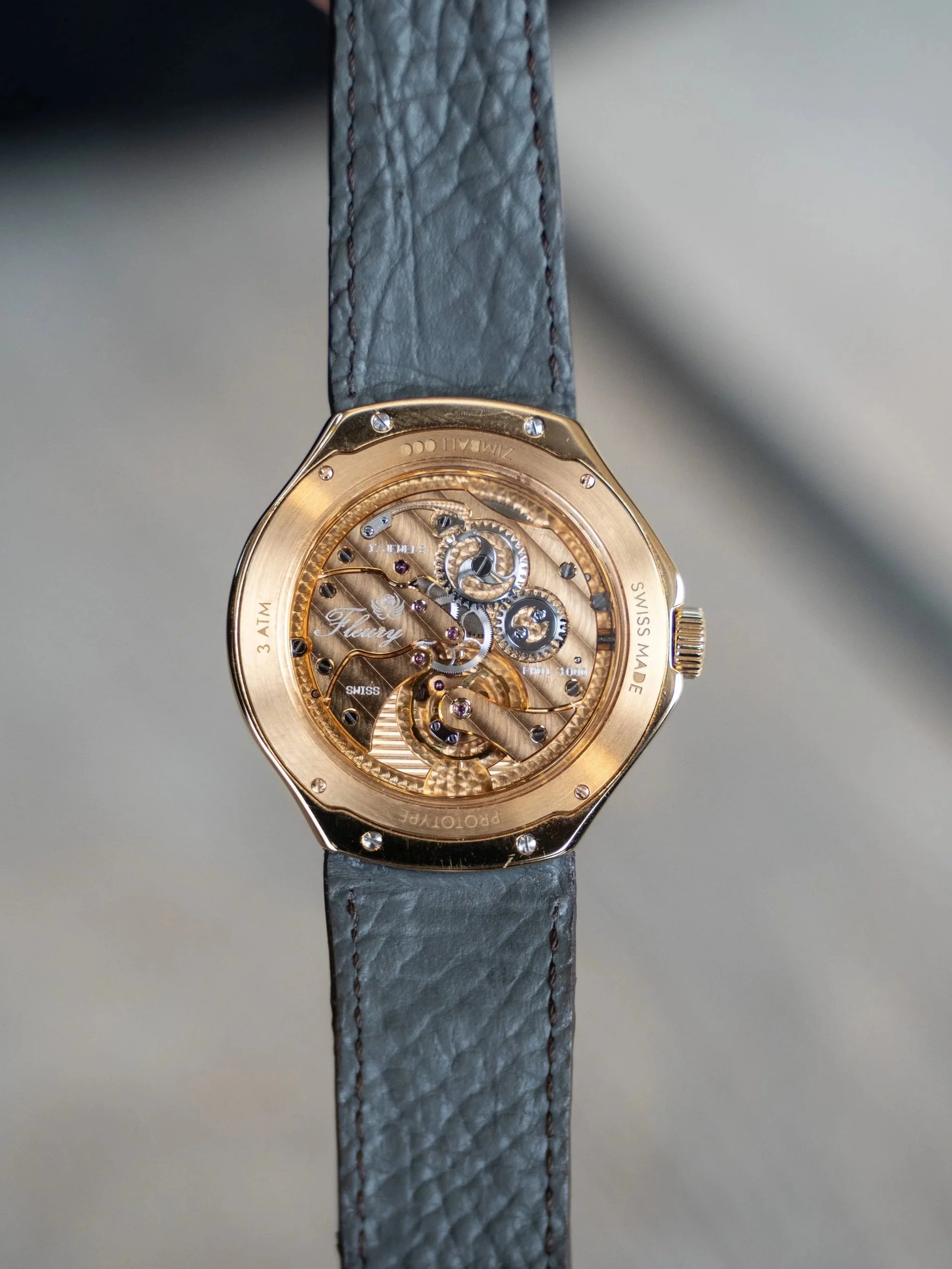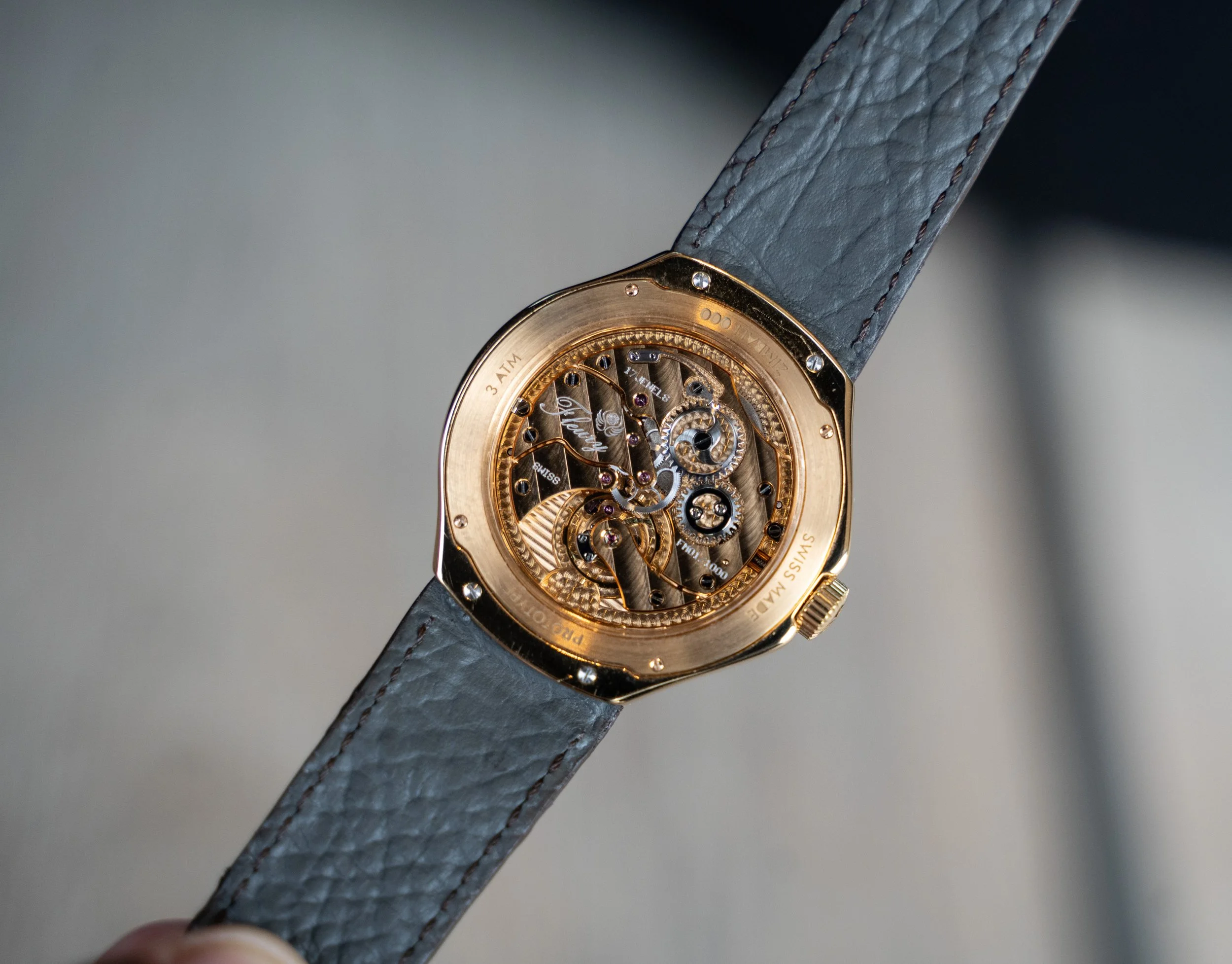 The calibre FM01, visible through the sapphire case back, reflects an uncompromising dedication to aesthetic and mechanical excellence. Developed in collaboration with Manufacture Fleury, this hand-wound movement pays tribute to the enduring heritage of Swiss watchmaking.